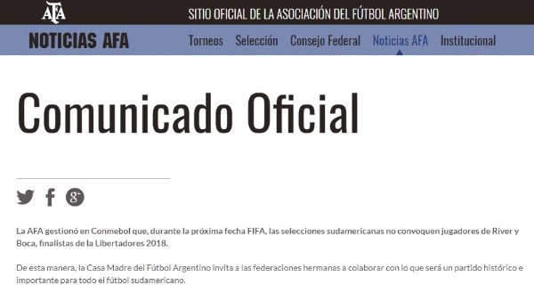 “La AFA gestionó en Conmebol que, durante la próxima fecha FIFA, las selecciones sudamericanas no convoquen jugadores de River y Boca, finalistas de la Libertadores 2018“, informó el ente madre del fútbol argentino.