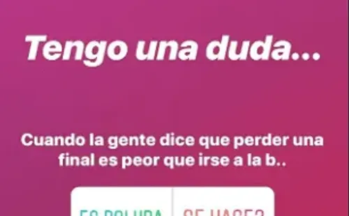 “Tengo una duda… Cuando la gente dice que perder una final es peor que irse a la B, ¿es boluda o se hace?”, invitó a votar Noelia a sus seguidores a partir de una historia de Instagram.