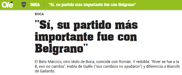 En diálogo con Olé, Alberto Márcico, referente de Boca, habló sobre lo sucedido en la Copa Libertadores y aprovechó para dispararle con munición gruesa contra el Millonario: “Creo también queel partido más importante de la historia de River fue ante Belgrano,cuando descendió”.