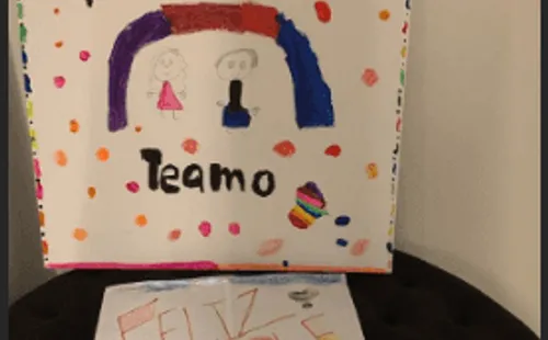 La pequeña, además de realizar una serie de dibujos, escribió en dos hojas: “Papa team. Te amo. Feliz cumple papi”.