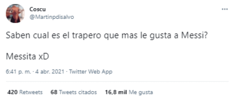 Desvelando la respusta en la misma publicación, Coscu replicó: “Messita“. El posteo en cuestión, como era de esperarse, no tardó en viralizarse y en menos de un día superó los 17.000 ‘Me gusta’ y los 400 Retweets.