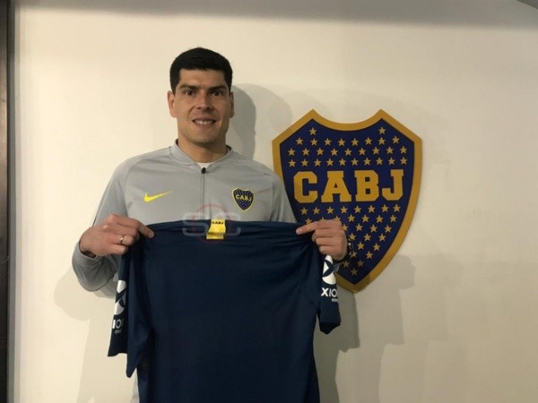 El arquero, luego de hablar, posó con la camiseta Xeneize que tenía su nombre pero no su número. Sí, real. No tenía número.