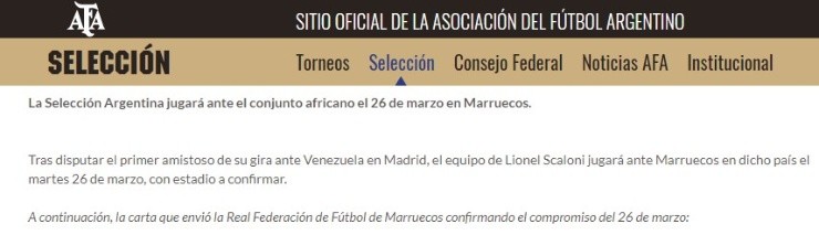 La Selección Argentina confirmó que jugará el 26 de marzo un amistoso ante Marruecos, también en España pero con estadio a confirmar.