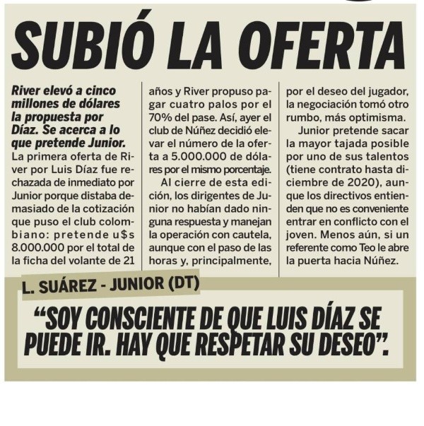 “Riverelevó a cinco millones de dólares la propuesta por Díaz. Se acerca a lo que pretende Junior”, remarca Olé en este nuevo capítulo de la novela del mercado de pases.