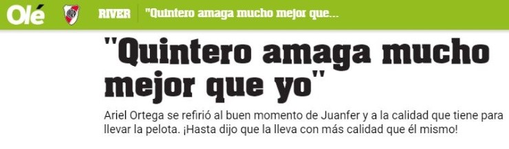 Al ser consultado, Arielhabló sobre Juanfer y se deshizo en elogios:“A Quintero lo veo muy bien. Es un gran jugador. River espera mucho de él. Amaga mucho mejor que yo”.