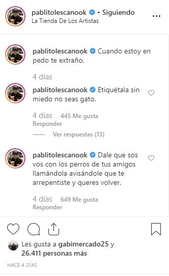 En los comentarios, la siguió: “Etiquétala sin miedo no seas gato”. Y redobló la apuesta: “Dale que sos vos con los perros de tus amigos llamándola avisándole que te arrepentiste y queres volver”.
