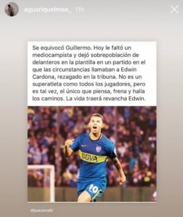 A través de su cuenta de Instagram, Agustín compartió dos historias en las que se lo pudo ver reclamando repetidamente la presencia de Cardona, que seguramente no continuará en las filas del club.