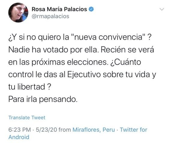“¿Cuánto control le das al Ejecutivo sobre tu vida y tu libertad?”, se preguntó después. Tras ello, en twitter se hizo tendencia. Su cambio de perfil, el pasado fujimorista, su parecido al trumpismo y el recuerdo de no querer derechos para los trabajadores fueron algunas de las críticas que más recibió la periodista. Ella, como viene haciendo, no responde y bloquea.