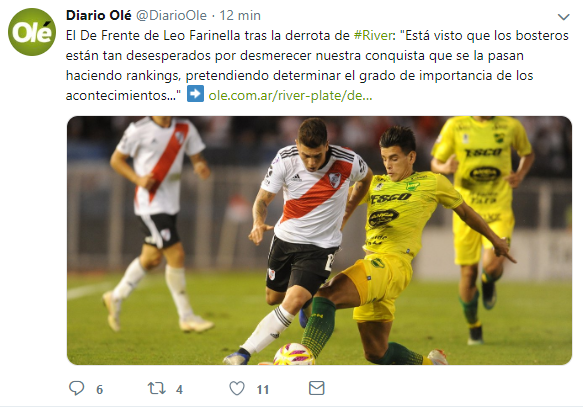 Tras la derrota 1-0 ante Defensa y Justicia en El Monumental, el periodista Leo Farinella se expresó en la columnaDe frente, que escribe para el diarioOlé, aunque curiosamente se dedicó a hablar de Boca.