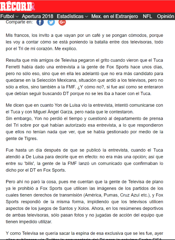 En su edición de hoy, reveló que se habría desatado una fuerte disputa entre Televisa y Fox Sports, luego de que esta última le haya hecho una entrevista a Ricardo Ferretisin la autorización de la primera. No solo eso, sino que en la charla adelantó que no era más candidato para dirigir a la Selección de México.