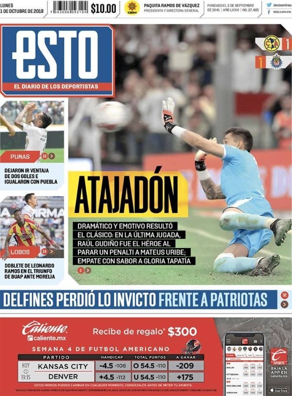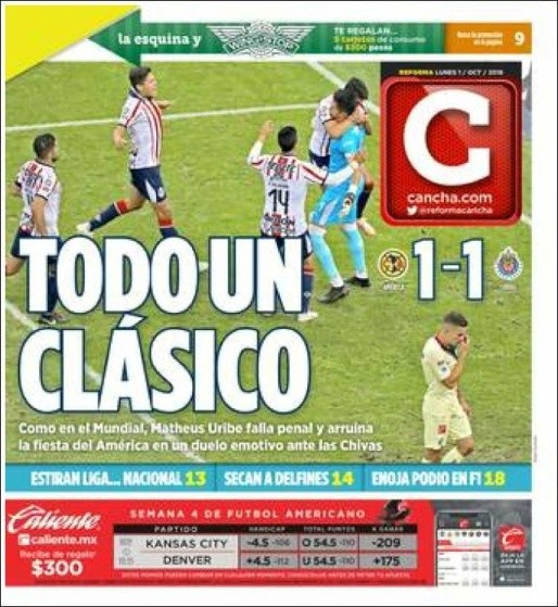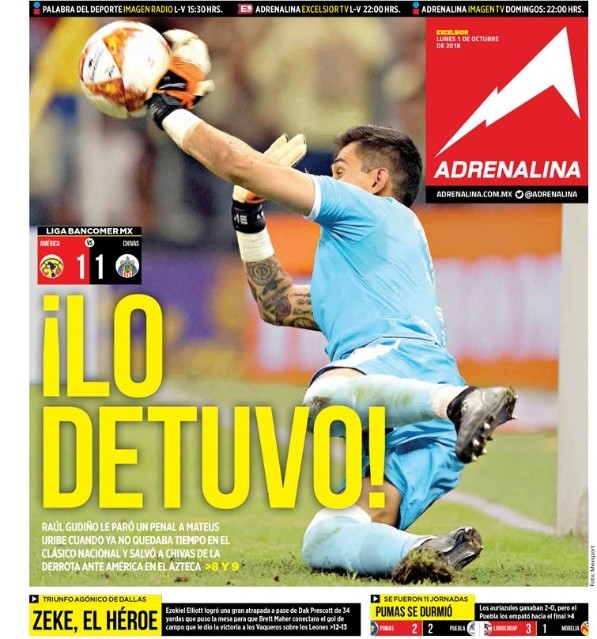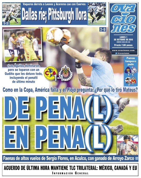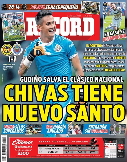 Como era de esperarse, Raúl Gudiñoapareció en las portadas de los principales diarios de México y en algunos del resto del continente después de atajarle el penal a Matheus Uribe sobre la hora.