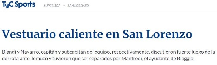 Según detalló TyC Sports, ya en el vestuario, el clima continuaba siendo tenso e incómodo. El medio argentino afirmó que Nicolás Blandi, capitán, yNicolás Navarro, subcapitán, tuvieron que ser separados por el ayudante deClaudio Biaggio, entrenador del club.