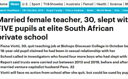 Un exalumno de ella, quien no estuvo íntimamente con ella, le contó a un diario de Sudáfrica: “Todos los hombres en la escuela estaban obsesionados con Fiona porque parecía una supermodelo. Pero la cuestión era que nunca coqueteaba y se presentaba como una niña muy tímida, inocente y muy agradable, y escuchar estas acusaciones me ha impresionado a mí y a muchos de los chicos con los que fui a la escuela. El tío de Fiona, Nick, era el entrenador de los Springboks, y su padre Dave entrena el rugby XV, y su abuelo Tony fue director aquí durante casi 20 años después de que emigró de Inglaterra”.