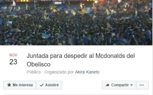 Sí, como lees: en Facebookya han puesto “asistiré” casi cinco mil usuarios a la “Juntada para despedir al McDonalds del Obelisco”.