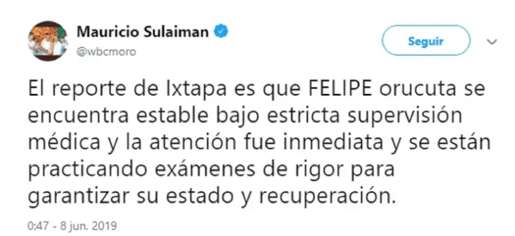 “El reporte de Ixtapa es que Felipe Orucutaseencuentra establebajo estricta supervisión médica y la atención fue inmediata. Se están practicando exámenes de rigor para garantizar su estado y recuperación”, aseguró en sus redes Mauricio Sulaiman, presidente del CMB.