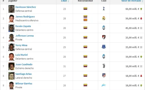 Una vez más, por edad y proyección, Dávinson Sánchez se configura en el futbolista colombiano más valioso del mercado. El valor de su transferencia ya se elevó a 60 millones de euros. Le siguen James Rodríguez y Duván Zapata con 50 y 45 millones de euros, respectivamente.