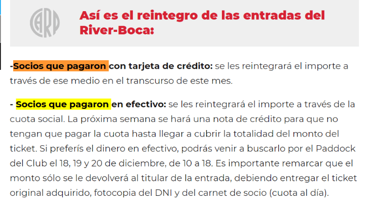 Para aquellos que abonaron en efectivo, el club les reintegrará el importe a través de la cuota social. Además, el comunicado aclara que la próxima semana se hará una nota de crédito para que no tengan que pagar la cuota hasta llegar a cubrir la totalidad del monto del ticket.