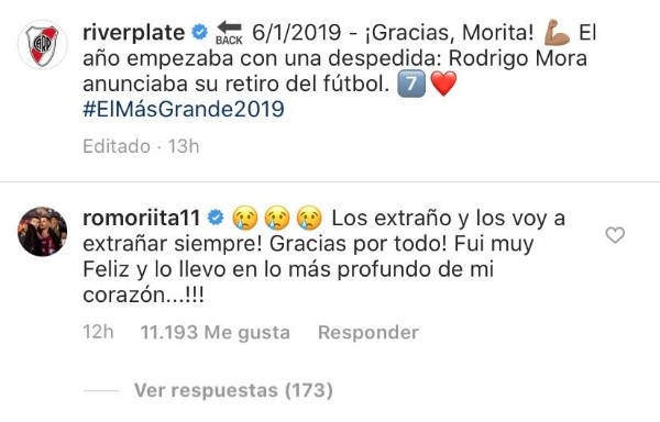 “¡Gracias, Morita!El año empezaba con una despedida: Rodrigo Mora anunciaba su retiro del fútbol”, es el texto que acompaña a una foto del ‘7’ tocándose el escudo y saludando a la gente.