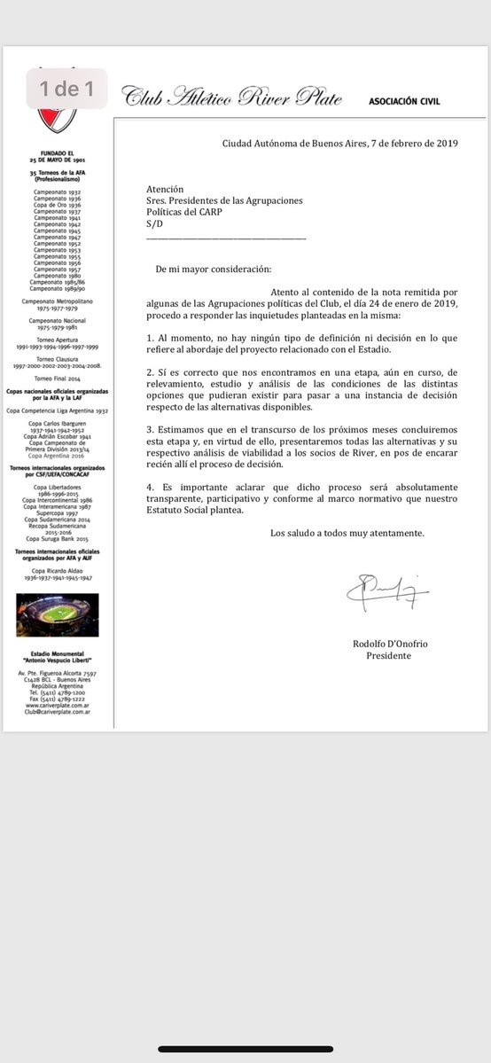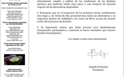 En este contexto, el máximo dirigente Millonario firmó una carta oficial que sacó el club hablando del tema, para calmar las aguas.