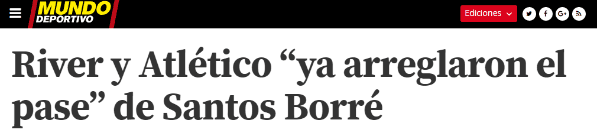 “Riverha adelantado el tema mío y deJuanfer, parece que ambos ya están solucionados. Tuvieron la oportunidad de hablar conAtlético de Madridy tengo entendido que ya arreglaron los clubes”, afirmó el propio jugador aBlog Deportivo.