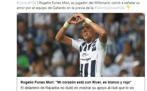 “Mi corazón está con River, es blanco y rojo”, señaló a la prensa mexicana tras ser consultado sobre la final de Copa Libertadores que este sábado consagrará al Millonario o a Boca como campeón.