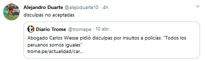 Tras ello, Alejandro Duarte, arquero de la Selección Peruana, no quiso dejarlo pasar. “Disculpas no aceptadas“, escribió el portero en su cuenta de Twitter.