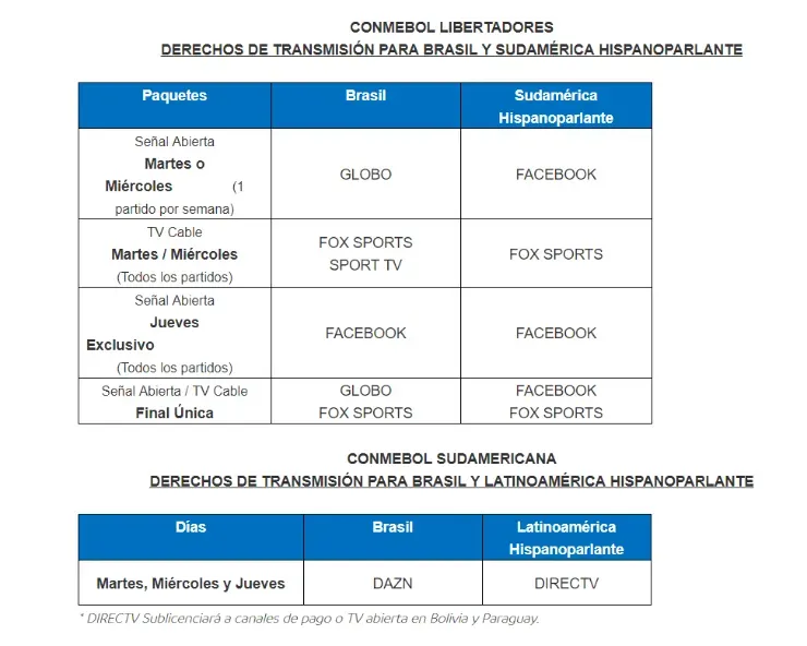 La principal novedad reside en que el Consejo de la CONMEBOL aprobó la exclusividad de Facebook para transmitir los partidos del certamen a disputarse los días jueves y, al menos, uno a jugarse los martes y miércoles.