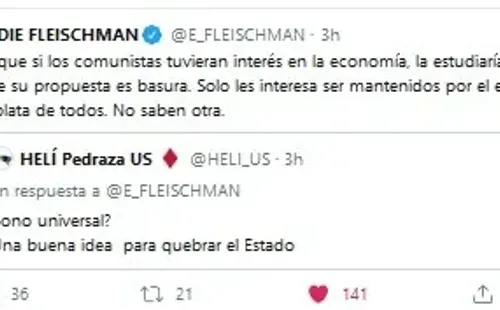 Luego, se manifestó más específicamente con respecto al Bono Universal del que se estaba debatiendo: “Es que si los comunistas tuvieran interés en la economía, la estudiarían y sabrían que su propuesta es basura. Solo les interesa ser mantenidos por el estado con la plata de todos. No saben otra”.