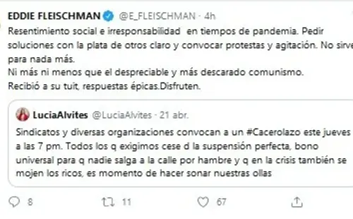 Eddie Fleischman, además de deporte, también gusta de meterse en estos temas y en esta ocasión no fue excepción. No fue primera vez que asoció a la izquierda o la asistencia social con lo perverso y lo malo: “Pedir soluciones con la plata de otros claro y convocar protestas y agitación. No sirven para nada más“, comentó por ejemplo un Tweet.