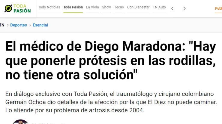 “Tiene una severa artrosis en sus dos rodilas y ya no tiene cartílagos. Eso le provoca mucho dolor, inflamación y dificultad para desplazarse. Hay que operarlo y ponerle prótesis en sus dos rodillas. A corto plazo hay que tomar la decisión del reemplazo articular. Sus rodillas no tienen otra solución” afirmó el doctor, en una entrevista para Total Pasión.