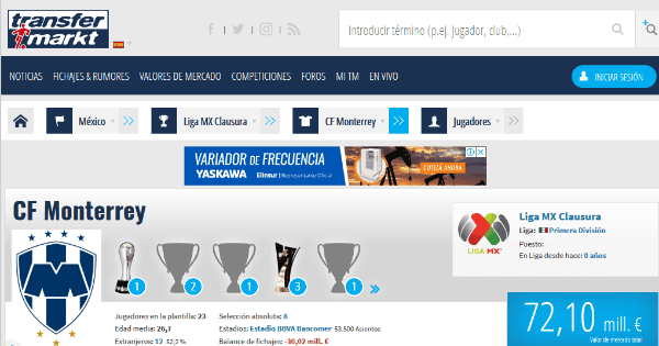 Según el sitio “Transfermarkt”, Los Rayados ocupan el primer lugar con un valor de 72.1 millones de dólares. Lo siguen los dirigidos por Ricardo Ferretti, con 63.9. Tercero está el campeón, con un total de 58.2.