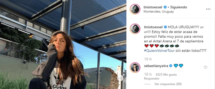 “Falta muy poco para vernos en el Antel Arena el 7 de septiembre”, escribió Tini. Lógicamente, la diva recibió un sin fin de comentario positivos.