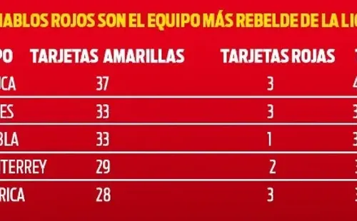 Después de losDiablos Rojos, en esta tabla de indisciplina se encuentraTigres con 36 cartones, Puebla con 34 y Monterrey, con 31.