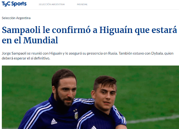 Jorge Sampaoli continuó su gira por Europa y tuvo una reunión conGonzalo Higuaín en Turín, donde después de mucha incertidumbre, le confirmó que estará entre los convocadospara representar a la Selección Argentina en el Mundial de Rusia 2018, como informa TyC Sports en su sitio web.