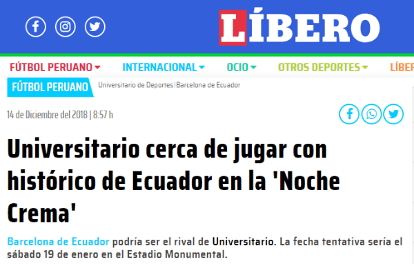 Según detalló Líbero, desde la dirigencia del club de Perú se estaría evaluando de forma seria proponerle a Barcelona de Ecuador ser el invitado de honor en la Noche Crema.