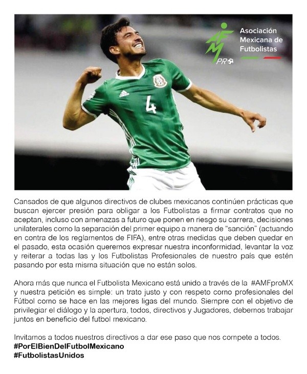 En las redes sociales, Raúl Jiménez, desde Portugal con el Benfica, le ha dado su respaldo a la carta de la AMFproMXcon el hashtag: “Por el bien del fútbol mexicano”.