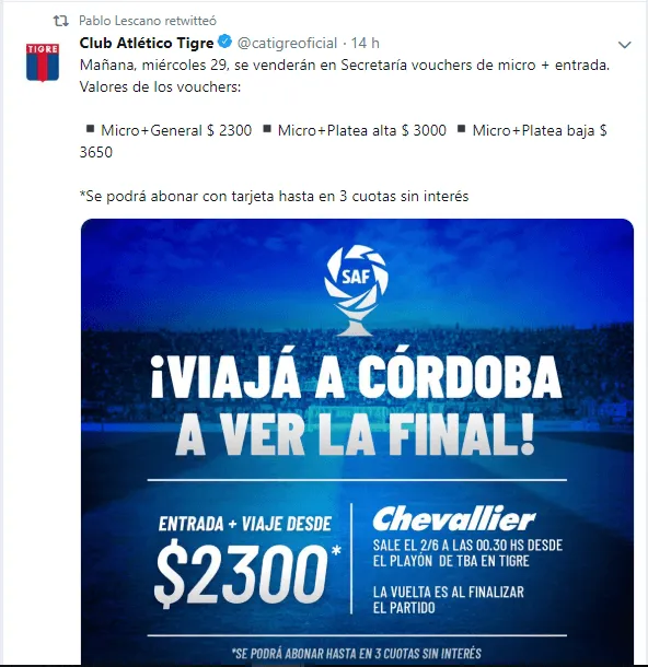 — Club Atlético Tigre (@catigreoficial) 28 de mayo de 2019