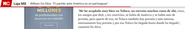 “Me he acoplado bien en Toluca, y no extraño muchas cosas del América, salvo los amigos que dejé. Allá se habla mucho de la presión, pero donde estoy también la hay y más interna” declaró el volante brasileño en entrevista con Radio Marca Claro.