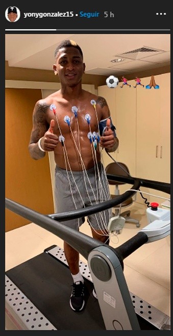 Motivado por lo que se viene, el atacante Yony González, agregó una historia a su Instagram mientras realizaba los chequeos médicos de su nuevo club. En próximas horas firmará su contrato y será presentado por el club.