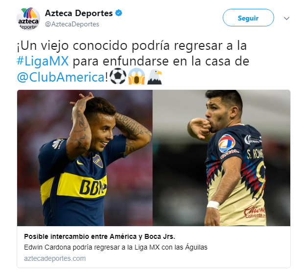 En relación a esta segunda posibilidad,Azteca Deportesdeslizó que Las Águilas intentarían convencer a Boca, uno de los pretendientes que el delantero tiene en Argentina, de realizar un trueque que llevaría al Nido al colombiano Edwin Cardona.