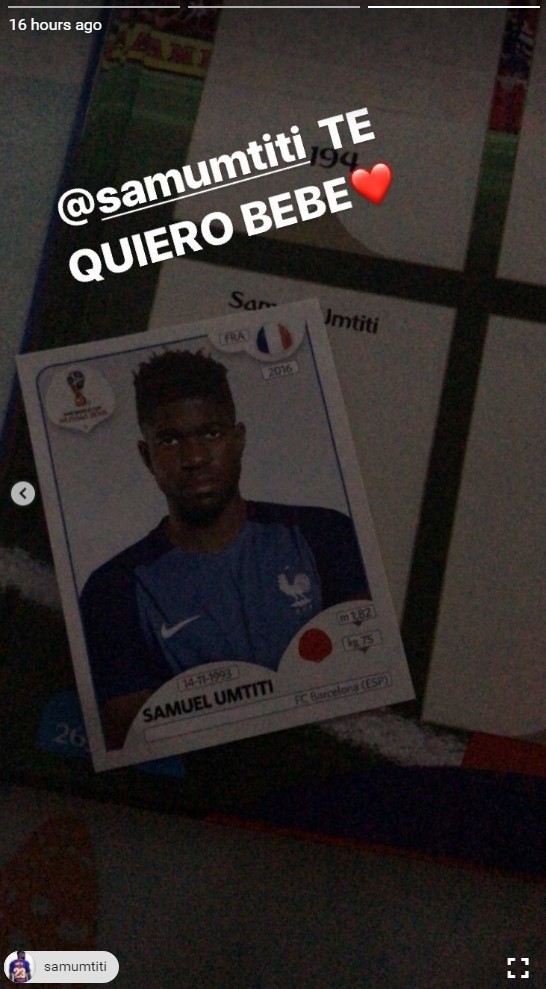 En una historia que subió a Instagram, la arquera mostró un cromodel defensor francés, de la colección del próximo Mundial, y la frase que acompañó la foto no dejó lugar para las dudas.