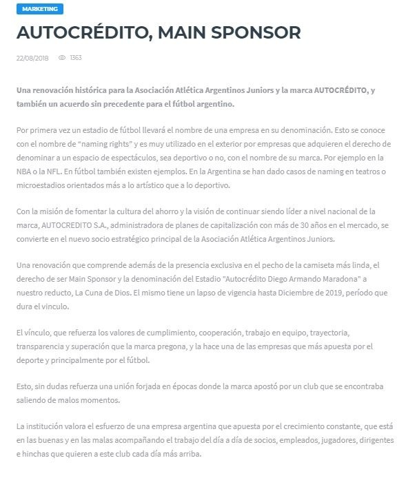 “Por primera vez un estadio de fútbol llevará el nombre de una empresa en su denominación. Esto se conoce con el nombre de ‘naming rights’ y es muy utilizado en el exterior por empresas que adquieren el derecho de denominar a un espacio de espectáculos, sea deportivo o no, con el nombre de su marca. Por ejemplo en la NBA o la NFL. En fútbol también existen ejemplos. En la Argentina se han dado casos de naming en teatros o microestadios orientados más a lo artístico que a lo deportivo”, explicaron los dirigentes.