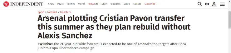 Al parecer, el grito de Guillermo retumbó y llegó a Londres, ya que el reconocido diarioThe Independentpublica en su página web que Cristian Pavón está siendo considerado por el Arsenal para reemplazar al chileno en caso de que decida partir ahora o tras el Mundial de Rusia.
