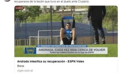 En los últimos días hubo sin embargo buenas noticias para el arco de Boca, porque los últimos pronósticos respecto a la evolución de Esteban Andrada indican que podría estar disponible para el partido final de la competición más importante del continente.