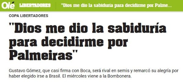 Con respecto a su decisión final, Gómez declaró: “Dios me dio la sabiduría de decidirme por Palmeiras”. Saltando a lo que será el cotejo por Copa Libertadores, el defensor analizó: “El partido con Boca va a ser muy bueno, de dos equipos que están muy bien, dos históricos”.