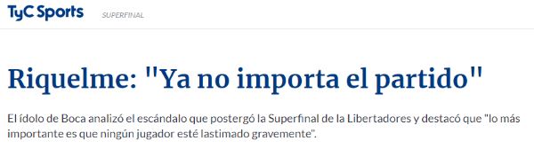 Dejando las puertas abiertas a una posible nueva postergación en caso que las condiciones no estén dadas, Riquelme cerró: “Si los jugadores de Boca no estaban en condiciones de jugar, mirando a (Marcelo)Gallardo, que es una persona tranquila, creo que no va a querer jugar hasta que los chicos estén en condiciones”.