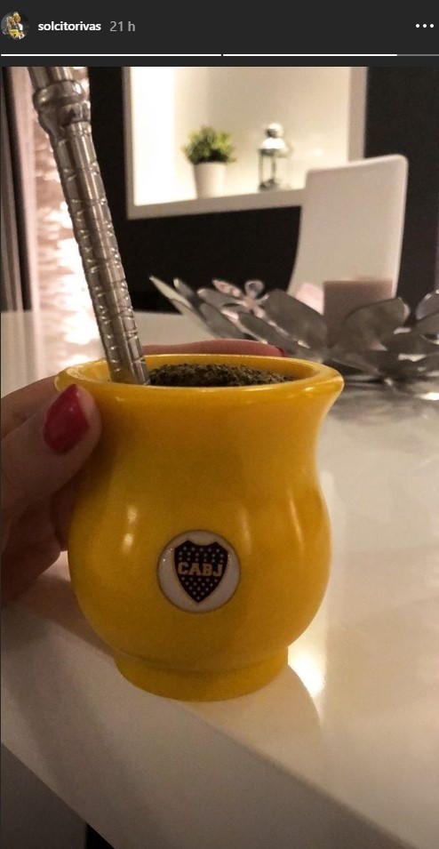 En su cuenta de Instagram, Sol Rivas, pareja de Nicolás Colazzo que se encuentra hoy en el fútbol griego, subió una foto tomando un mate de Boca, detalle que prueba que lleva al club de sus amores a todas partes.