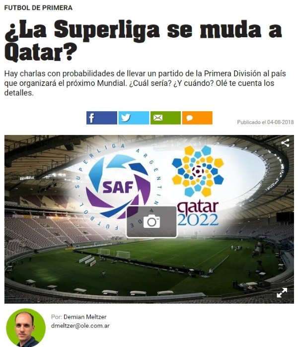 “Son charlas con posibilidades reales. A los organizadores del Mundial en Asia les interesa como movida para la difusión de Qatar 2022”, le confiaron a Olé desde las oficinas de la Superliga que comanda Mariano Elizondo, siempre atento a expandir las fronteras de su producto.