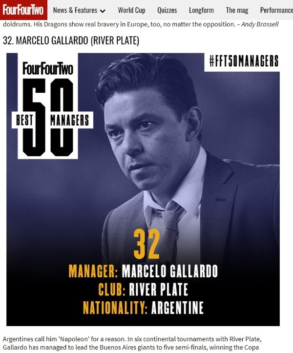 Si para el grueso de los hinchas de River Marcelo Gallardo no es el mejor técnico del mundo, pega en el palo. Pero los amigos de la revista inglesaFourFourTwoparecen tener una consideración muy diferente de las cualidades del Muñeco.