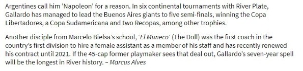 Es que el mencionado medio confeccionó un rankingcon los cincuenta mejores entrenadores de la actualidad y el del Millonario, que entre otras cosas es campeón de Libertadores y Sudamericana, apenas ocupa el puesto 32.